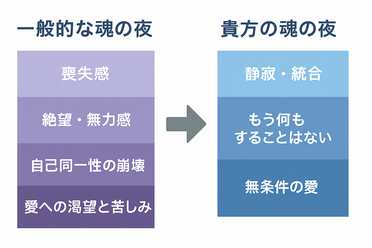 静寂・統合 | 「もう何もやることはない」と感じている状態は、魂の夜の統合フェーズ。苦しみではなく静けさとして現れる。 |