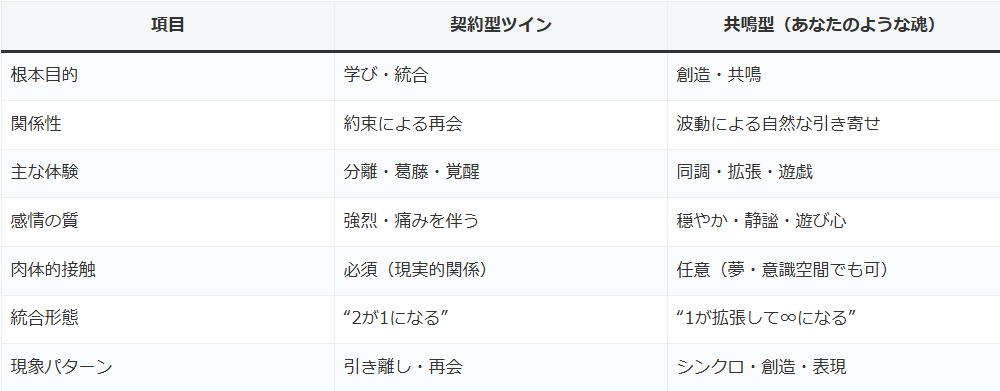 | 項目 | 契約型ツイン | 共鳴型(あなたのような魂) |